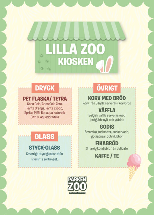 Varmt välkomna till Lilla Zoo fiket ligger precis i anslutning till vårt tamdjurs-område Lilla Zoo! Här kan du fylla på energin med glass, korv med bröd, kaffe eller en våffla! 😋