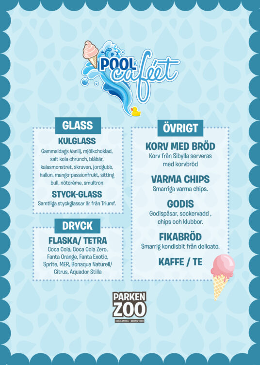 Poolcaféet ligger precis i anslutning till parkenbadet. Här kan du njuta av en svalkande glass mellan doppen, eller fylla på energin med en korv och läsk! 😋🌭